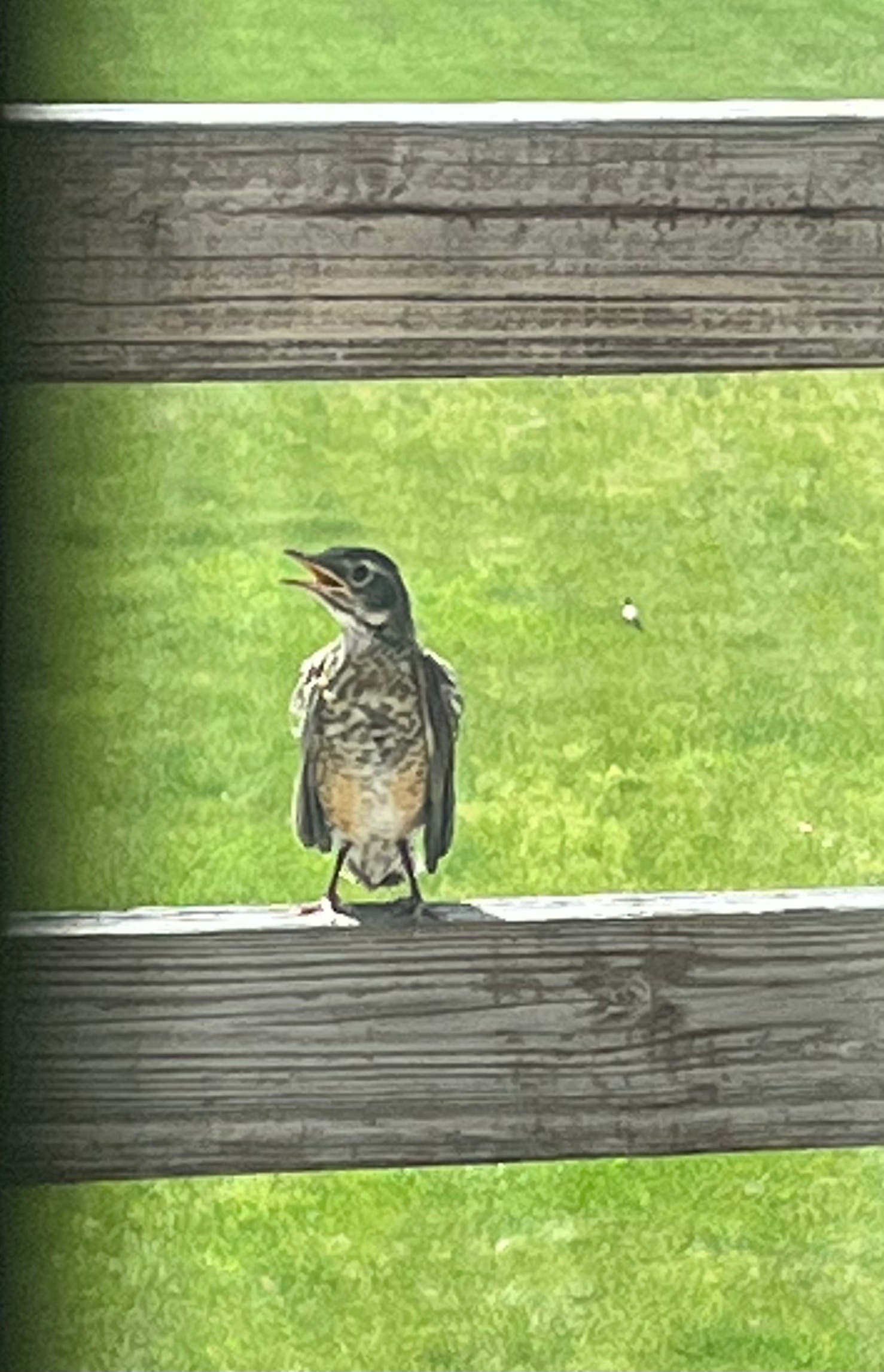 Yesterday, while sitting at the computer trying to get some work done, I found myself distracted (honestly, it doesn’t take much) by something outside my window. Sitting on the deck rail was this little fledgling robin. (Yes, our deck does need to get redone, but pay no mind to the splintering wood.)