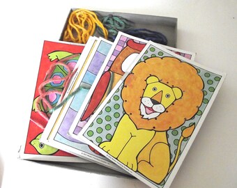 They were generally made of cardboard with colorful images printed on them with a series of connect-the-dots style holes. They came with a piece of yard with plastic tips at either end, like a shoelace, or if you were at Grandma’s house they were made out of an upcycled meat tray and a piece of yarn with Scotch tape at the ends.