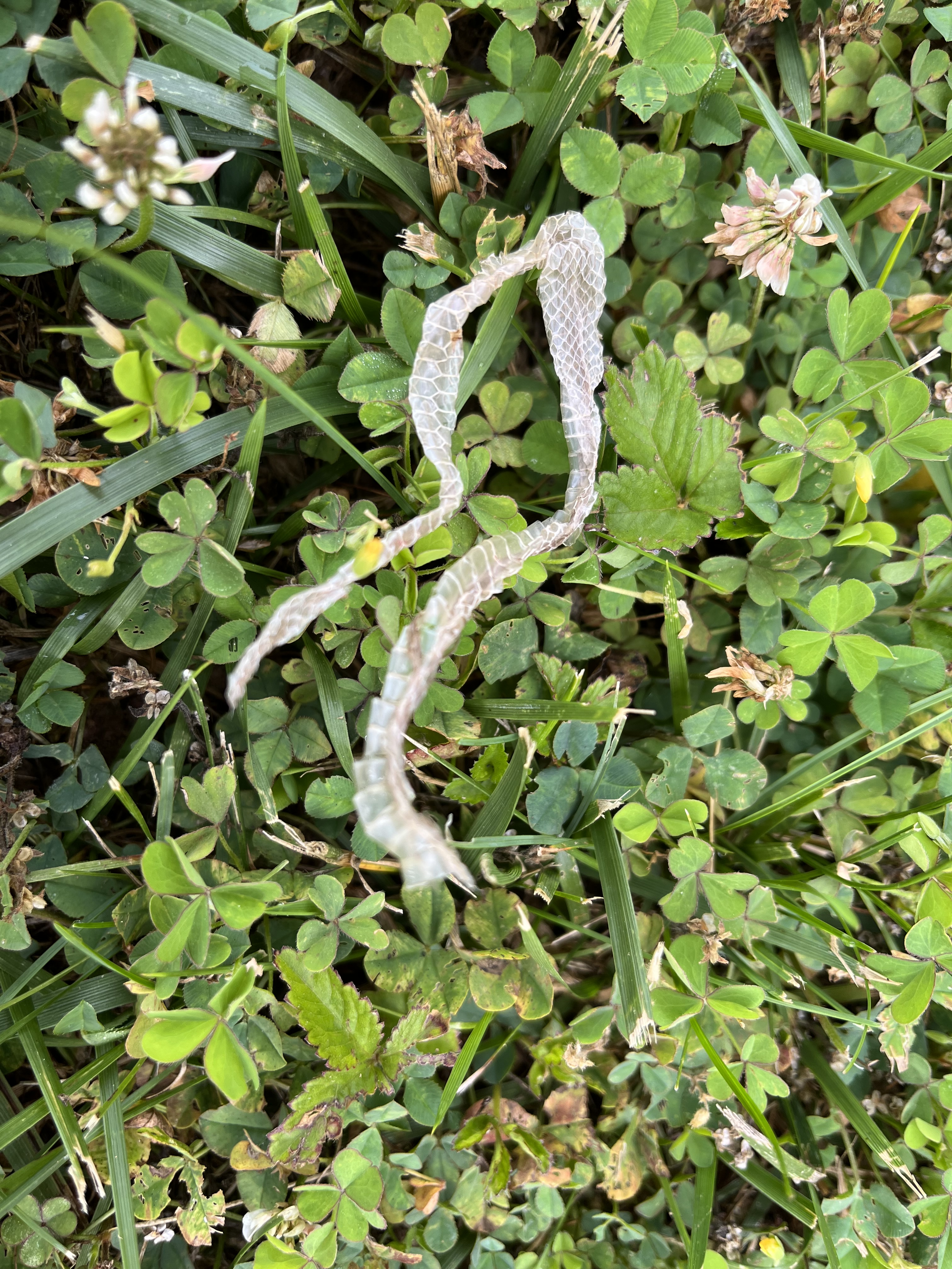 I haven’t seen my snake friend since I snapped his photo, but this morning when I was outside watering some plants, I noticed something in the grass not far from where I first saw the snake, and realized it was a shed snakeskin.