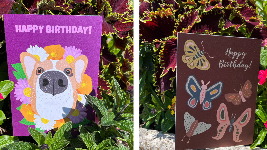 So, anyway, I was feeling pretty cocky about my front lines flower pots and how well they were doing, besides a few nibbles here and there, the plants were mostly being left alone. Did I think to take a “before” picture to show off the lush flower pots? No, why would I do that? These flower pots were looking great and they were going to be going strong all summer. Last week I was doing a mini photo shoot of some greeting cards I designed for my Zazzle store a couple of which used one of the front line flower pots as a background. So I present these to you as exhibit A: