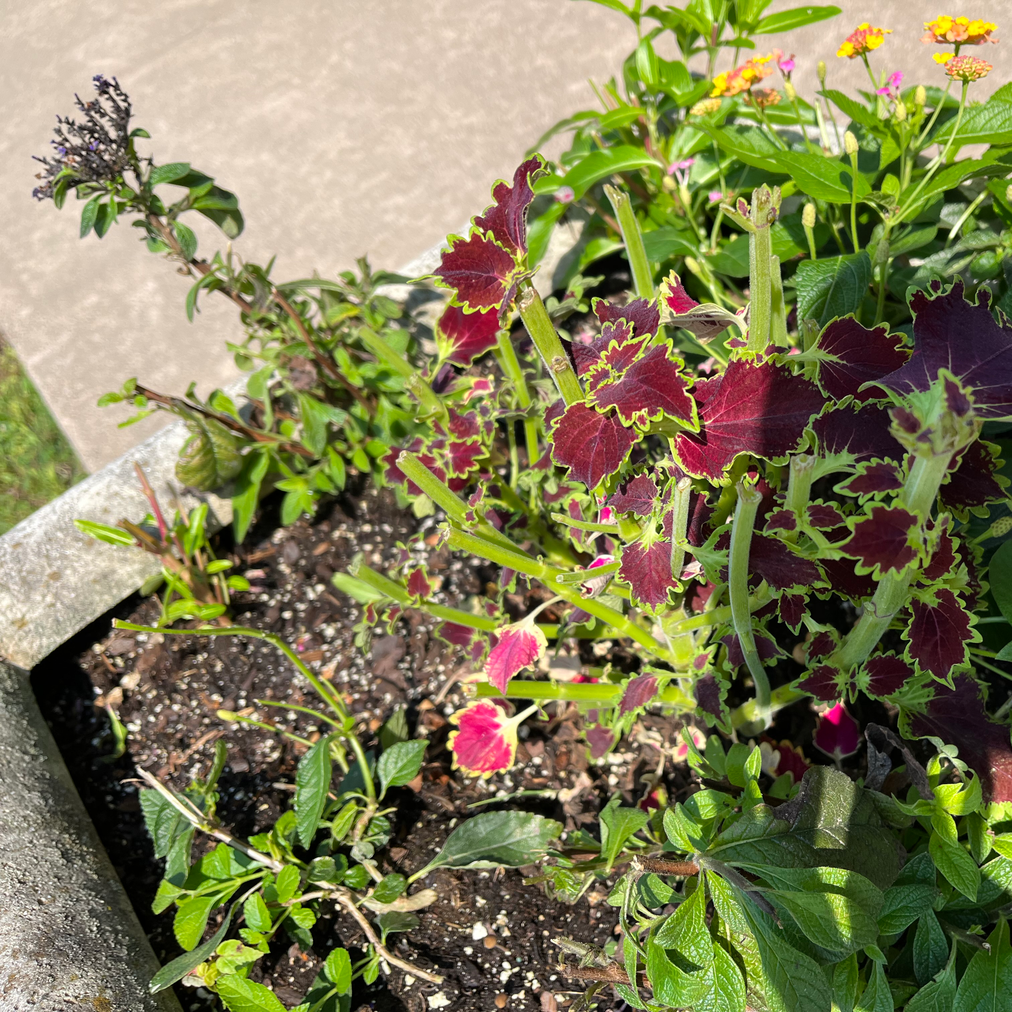 For the flower pots that are on the front lines (aka right where the patio meets the yard) I knew that I was going to have to contend with hungry deer. So, this year I tried to be a bit more mindful about what I planted there. Specifically I did some internet research on what plants liked the full sun and also were supposed to be “deer resistant” so that I could plant those at the edges of the pot. I ended up selecting some heliotrope and lantana and planted those around the edges of the pot and then filled in the pots with some more coleus and also some vinca. (They’re very large flower pots.)