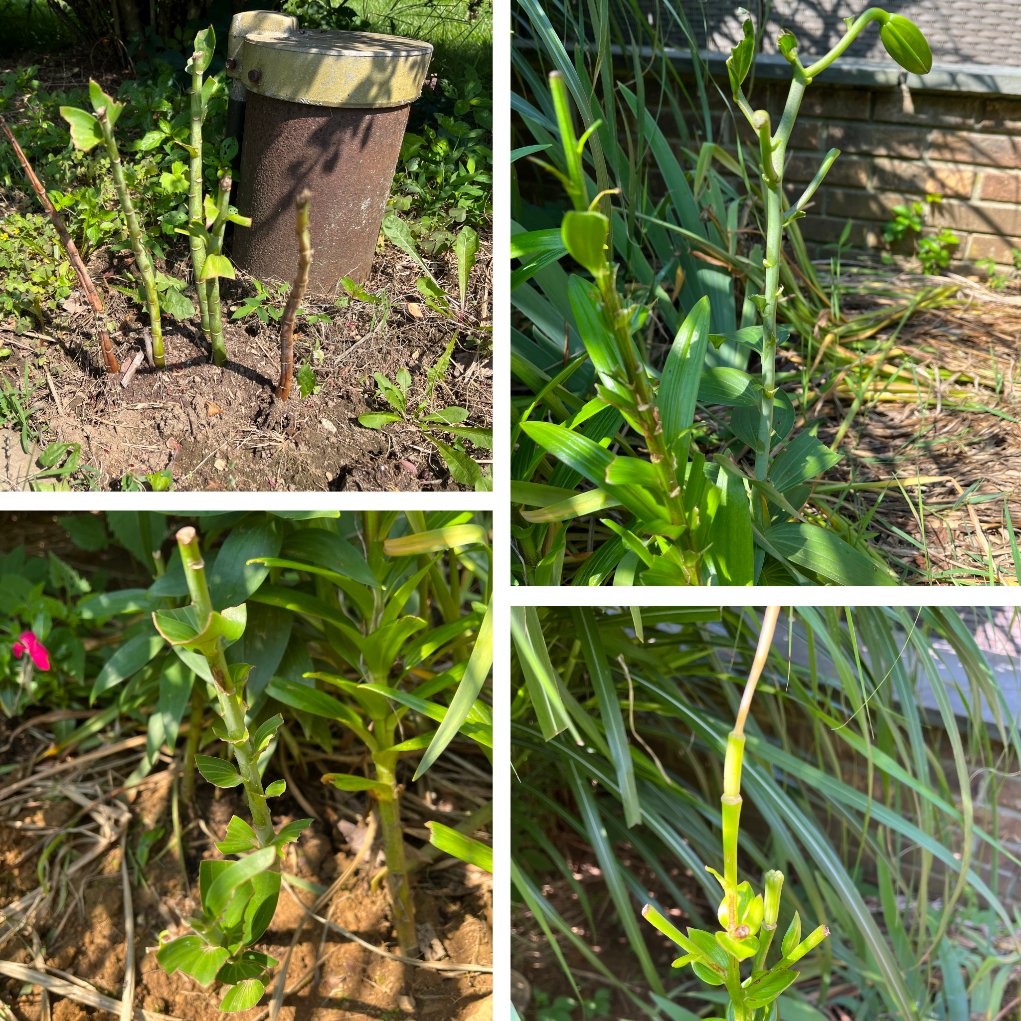 And guess what? It seemed to be working. I did notice here and there some nibbling going on, but it was nothing like the feasting I witnessed last year and nothing like the absolute carnage they inflicted on the lilies that I attempted to plant in the yard. So far, two lily flowers were allowed to briefly bloom before being devoured, but this photo collage shows the present state of the lilies in the yard: