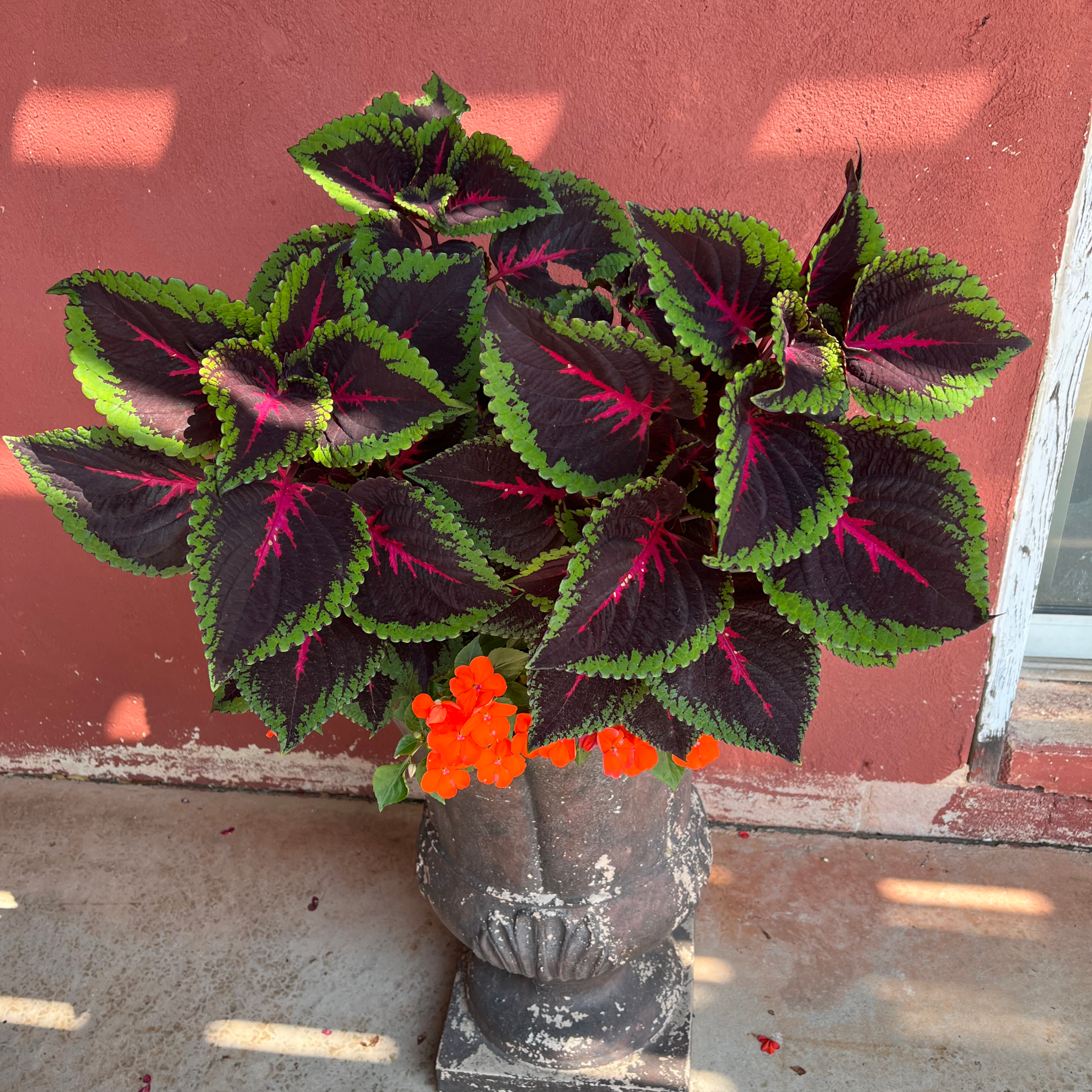 I pretty much limit my gardening efforts to maintaining four flower pots on our patio, and let me tell you, even that’s a challenge. Last year was my first year living here and doing my best with the patio flower pots. Mistakes were made, but I like to think I’m the sort of person that can learn from her mistakes. For example after getting off to a rough start last year, I figured out that the best things to grow in the shady flower pots close to the house are a combination of coleus and impatiens, and I’m happy to report that this year these pots are looking pretty good. Here’s some photographic proof: