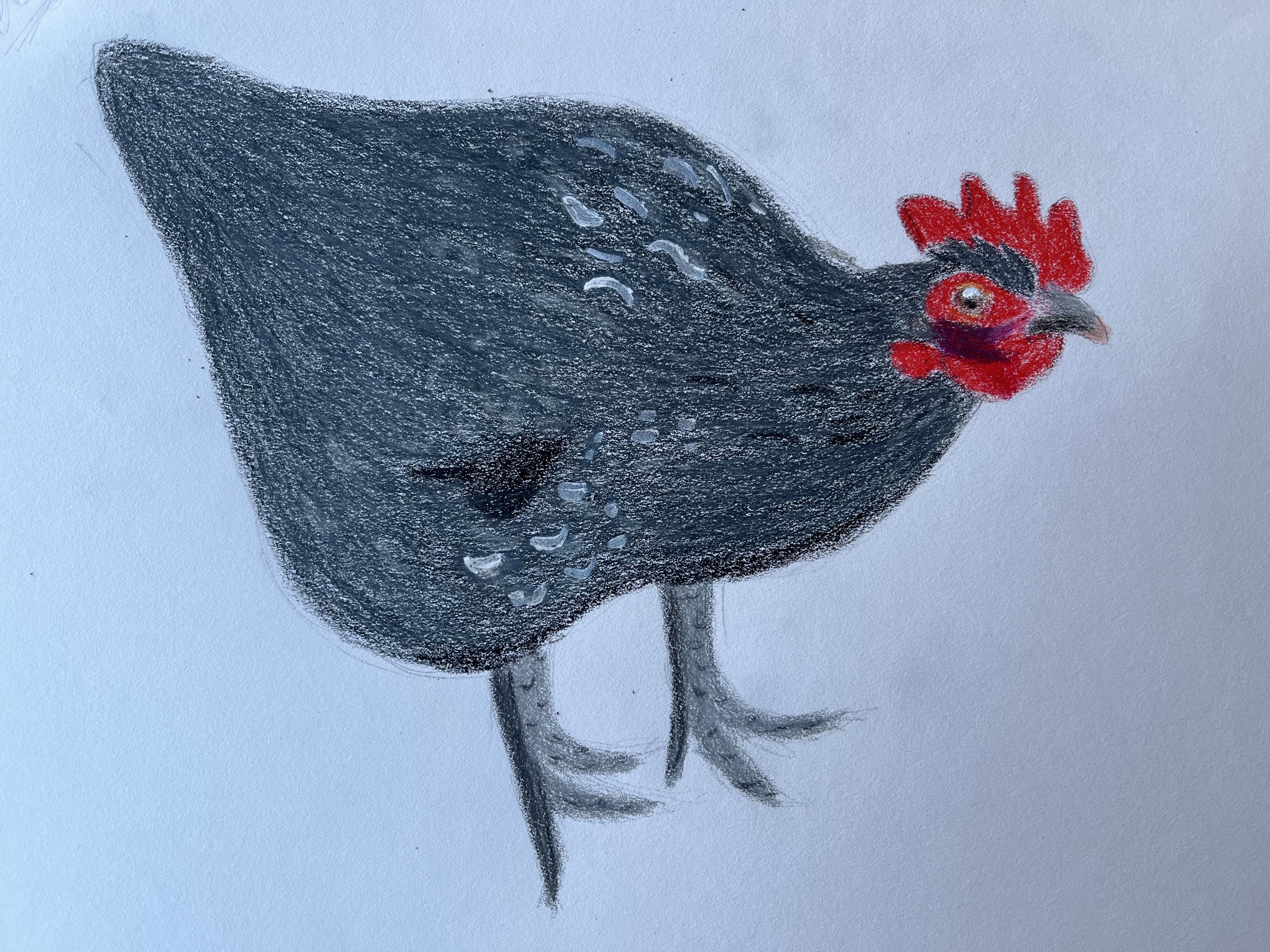 Photographer me, failed to account for the fact that future me would want to try to draw this chicken and thus took a photo that cropped out half of the bird. I attempted to sketch in the missing part of the chicken to the best of my (limited) ability. I also noticed after I was pretty far along in my colored pencil drawing that what I had first assumed was the chicken’s second foot was in fact just a shadow. So, anatomically my drawing was far from accurate. I had added the highlights before trying to do the darker feathers mistakenly scribbling right over the highlights. Then I tried to correct this with first a white gel pen (that ended up being dried out) and then some white acrylic paint that I tried to color over. In the end, I wasn’t especially happy with my chicken drawing:
