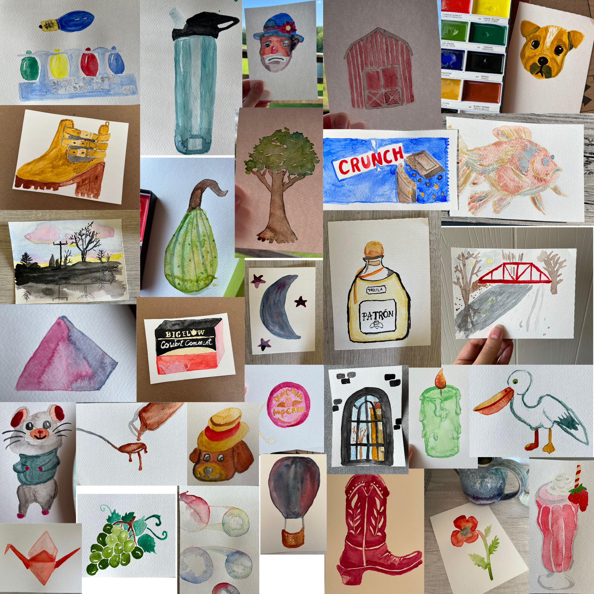 As you can see from the collage of paintings above, I am clearly not a master watercolor painter, but I had fun creating these different little paintings. I completed all 30 prompts in the challenge, but technically I didn’t paint every day. For those not familiar with watercolors, the medium does require some amount of waiting for paint to dry (and since we all know that’s not a terribly thrilling activity) it’s a good idea to work on more than one painting at a time so that you can get started on the next one while you’re waiting for the first to dry. So I usually would do a batch of 3 or 4 paintings at once.