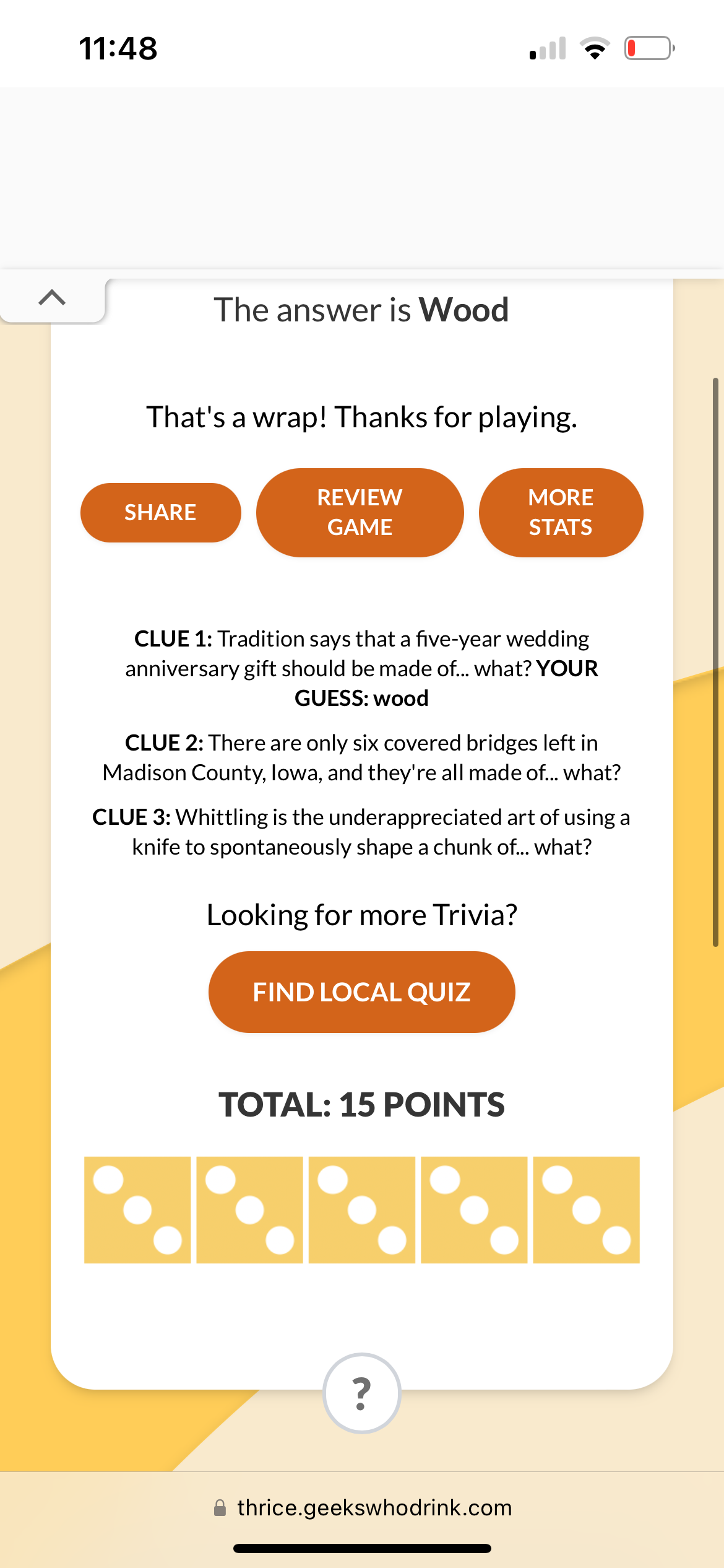 Ron and I have a nightly tradition. We play as a team the online trivia game Thrice. If you’ve never played this I encourage you to check it out. It tends to be pretty challenging. Each day there are five answers. There’s a total of three clues/questions for each answer. If you correctly get the answer on the first clue you get three points, on the second clue you get two points and if you get it on the third clue you get one point. If you manage to fail completely to guess it then you get a big fat X and zero points. Some days are trickier than others. I’ve set the goal of 11 for us. If we get 11 points I feel like we’re doing pretty good. The most we’ve gotten is 13 (at least when I initially wrote this, but read the postscript for an exciting update) and the worst, I’m embarrassed to admit, is 4. Did I mention that it can be very challenging?