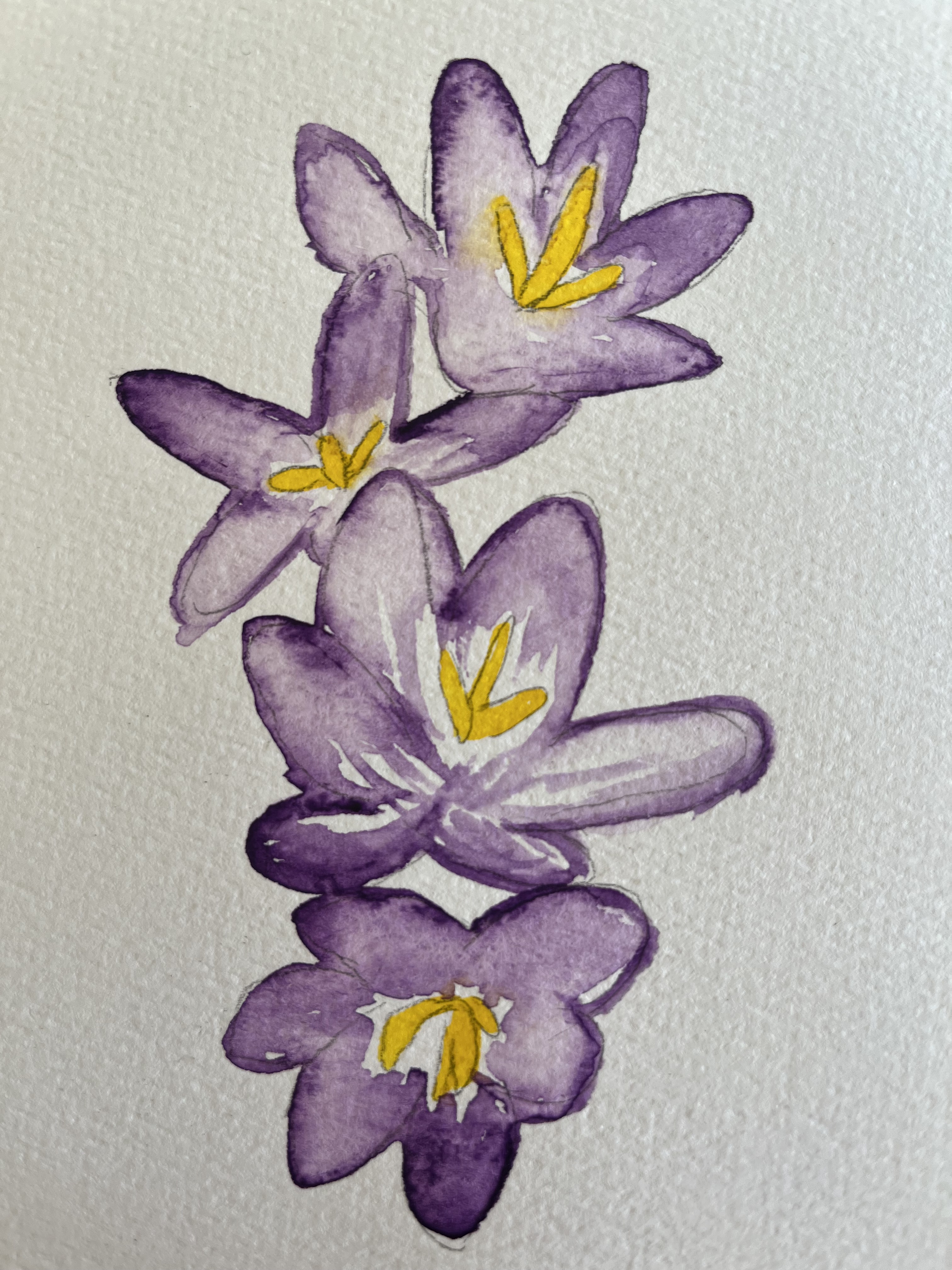 You’ll have to settle for this sloppy little painting of some crocuses (the internet tells me that croci is also an acceptable plural of crocus) that I painted the other day: