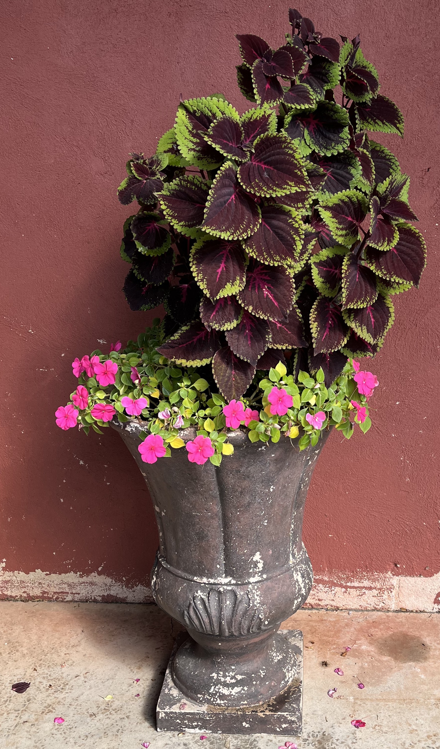 Two or three years ago I bought some coleus plants to put in our two outdoor shady planters and the plants really flourished there. So, at the end of the season I took some cuttings from the plants and attempted to keep them alive indoors in little planters through the winter, and lo and behold I did. In fact the plants or at least their descendants are still more or less thriving. Last year I took five separate cuttings figuring not all of them would take when transplanted indoors into the small flowerpots, but like our houseplants this coleus plant is forgiving and now I have five plants even though I need only two to stick in our outside planters.