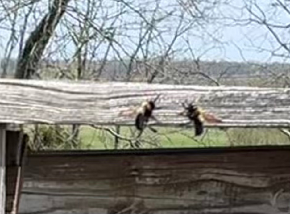 Up above on the deck we do have some other winged neighbors keeping us entertained. The carpenter bees spend the day out in the sun performing their aerial acrobatics and trying to chase off the wasps. Sometimes when they can’t find a wasp to attack they end up chasing other carpenter bees. Here’s a photo I attempted to take the other day of two carpenter bees chasing each other. Sorry it’s so blurry those insects are fast: