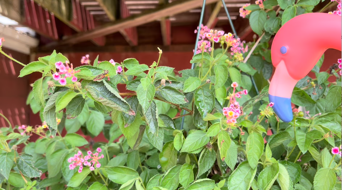 I worry about flooding the bird’s home but the lantana plant is thirsty especially in this heat. I try to aim the beak of my watering can (it has a beak because it’s shaped like a flamingo) at the opposite side of the flower pot from where I saw the nuthatch launch itself.