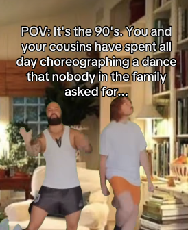 Over the weekend my sister texted me a link to this Facebook video, which our cousin had sent to her. In case you don’t feel like watching a video, there’s a screenshot above, which gives you a pretty good idea of what the video is all about. What made this video particularly relevant to us is that we lived through the 1990s, and we did on more than one occasion spend all day with our cousins choreographing our own dance routines that no one on earth had asked for.