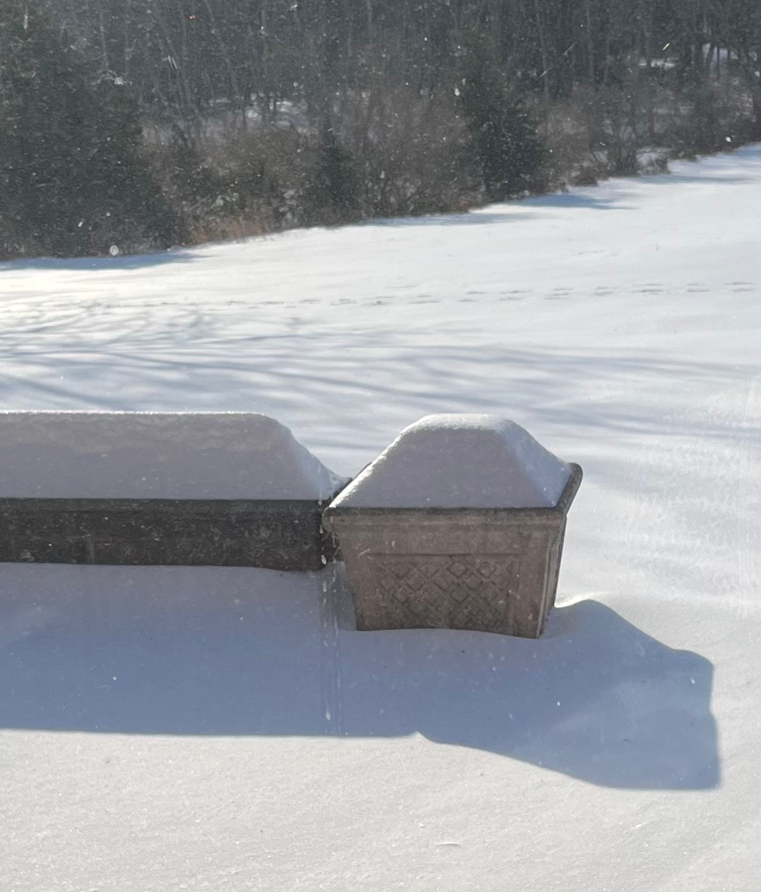 Our walk next door has grown longer. Not wishing to break an ankle trekking through the ice-encrusted snow, we walk out to the road (which has grown more narrow from all the snow) and then down the walk, but the cold and our desire not to get run over forces us to walk quicker. We look forward to being able to cut across the yard again. We look forward to seeing the yard once again.